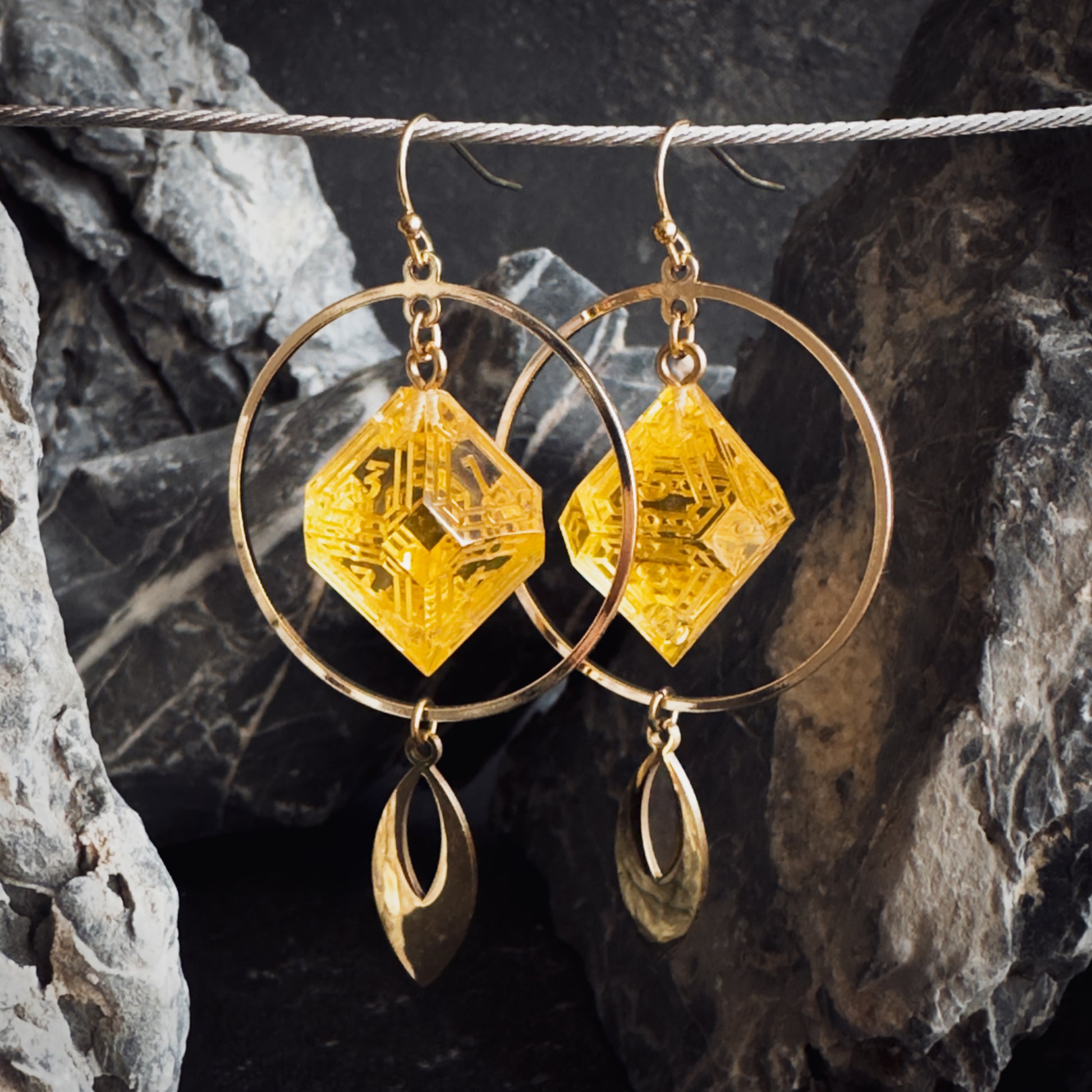 This pair of amber yellow D8 earrings is perfect for your next game night, adventure, or any time you want to bring your stories with you. Our sharp edge resin dice are poured, sanded, and painted by hand.