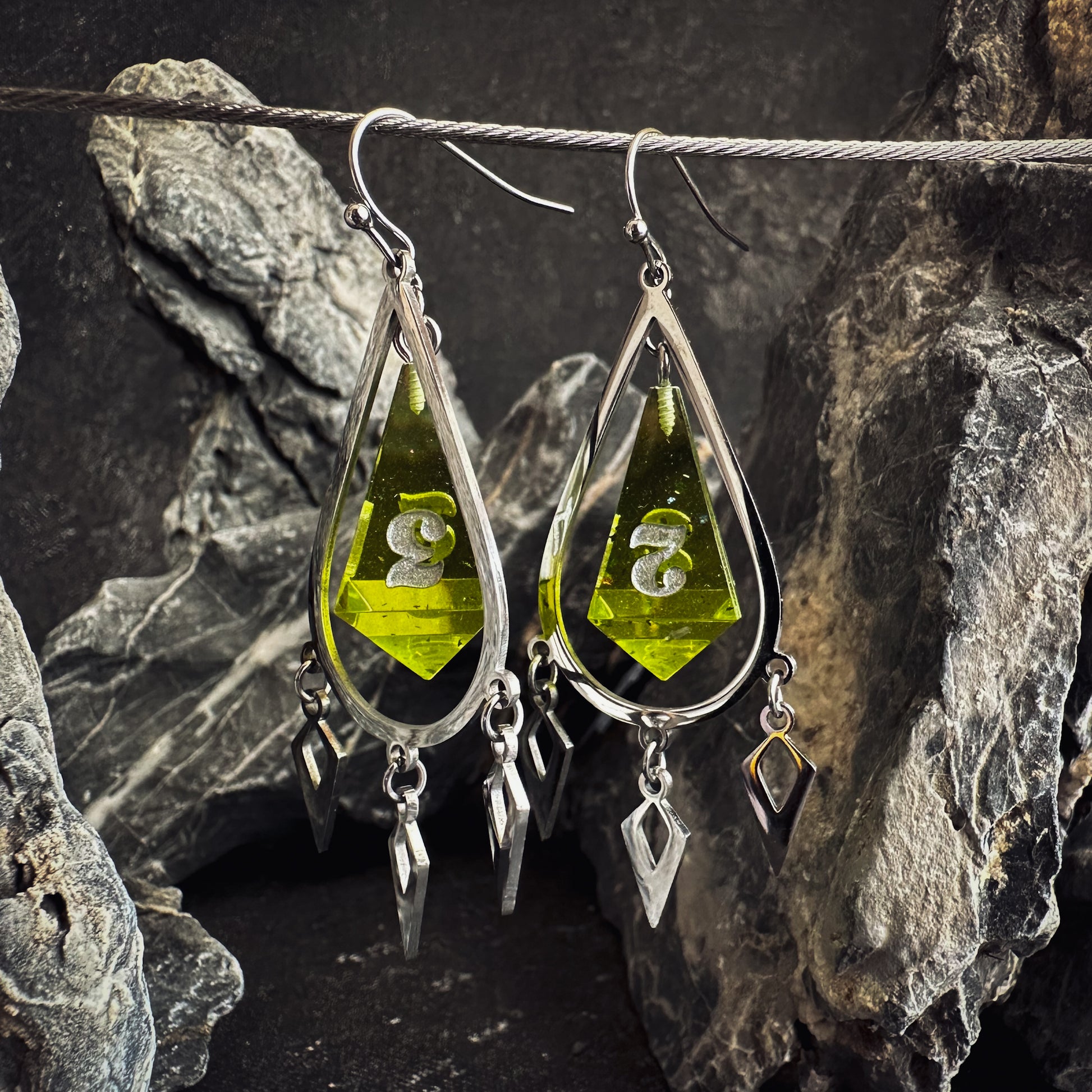 This pair of peridot green D4 dice earrings is perfect for your next game night, adventure, or any time you want to bring your stories with you. Our sharp edge resin dice are poured, sanded, and painted by hand.
