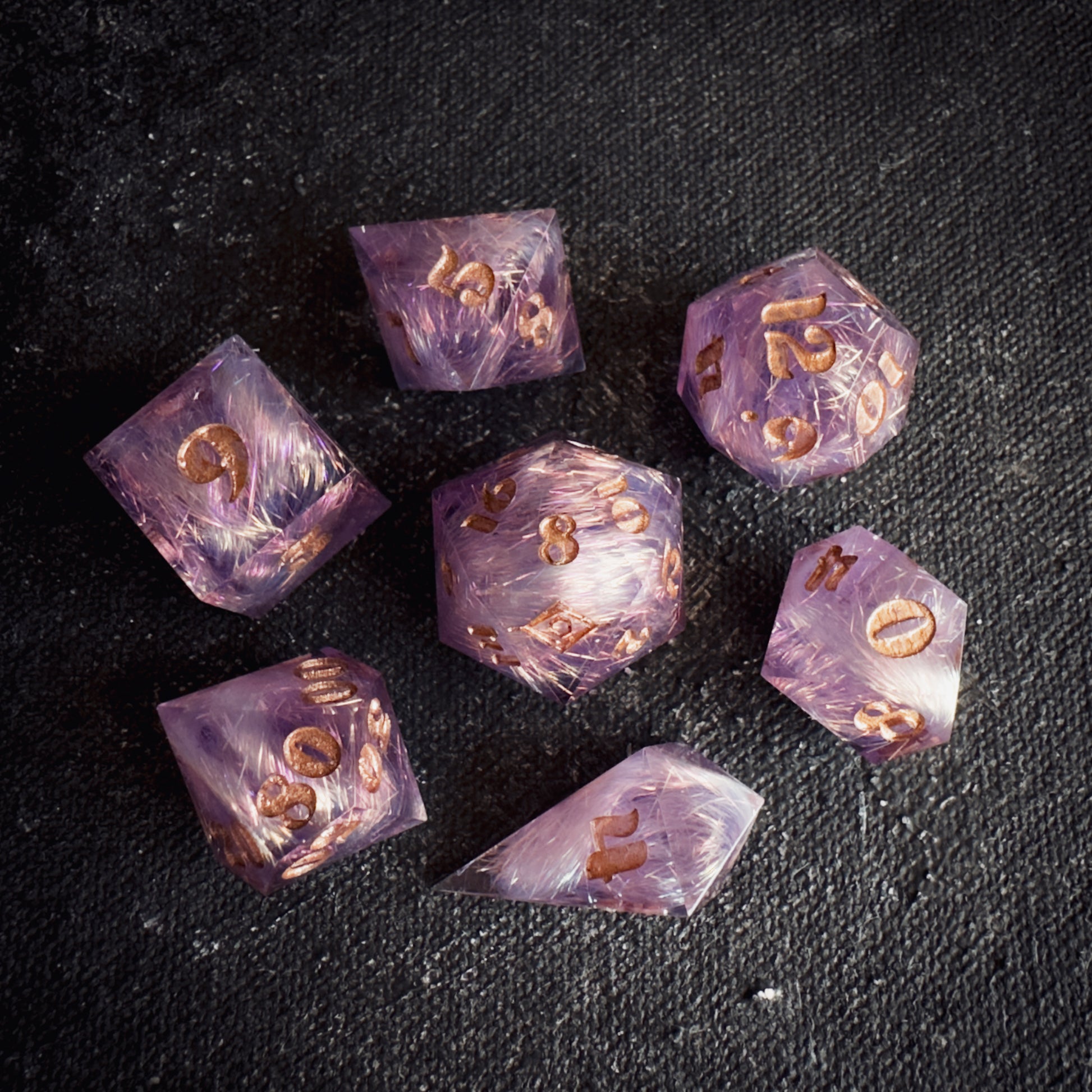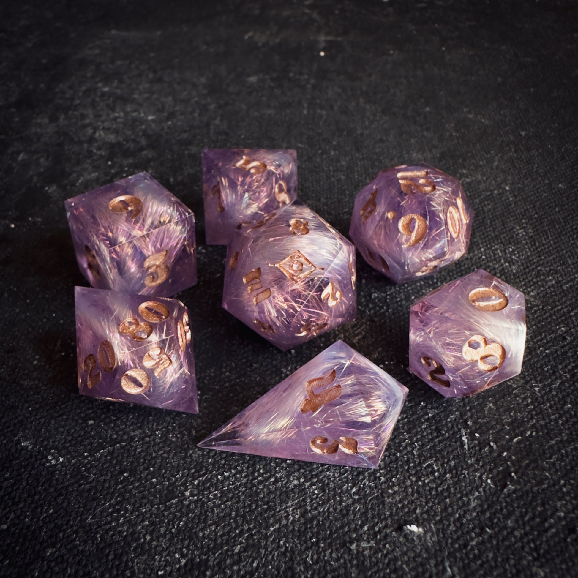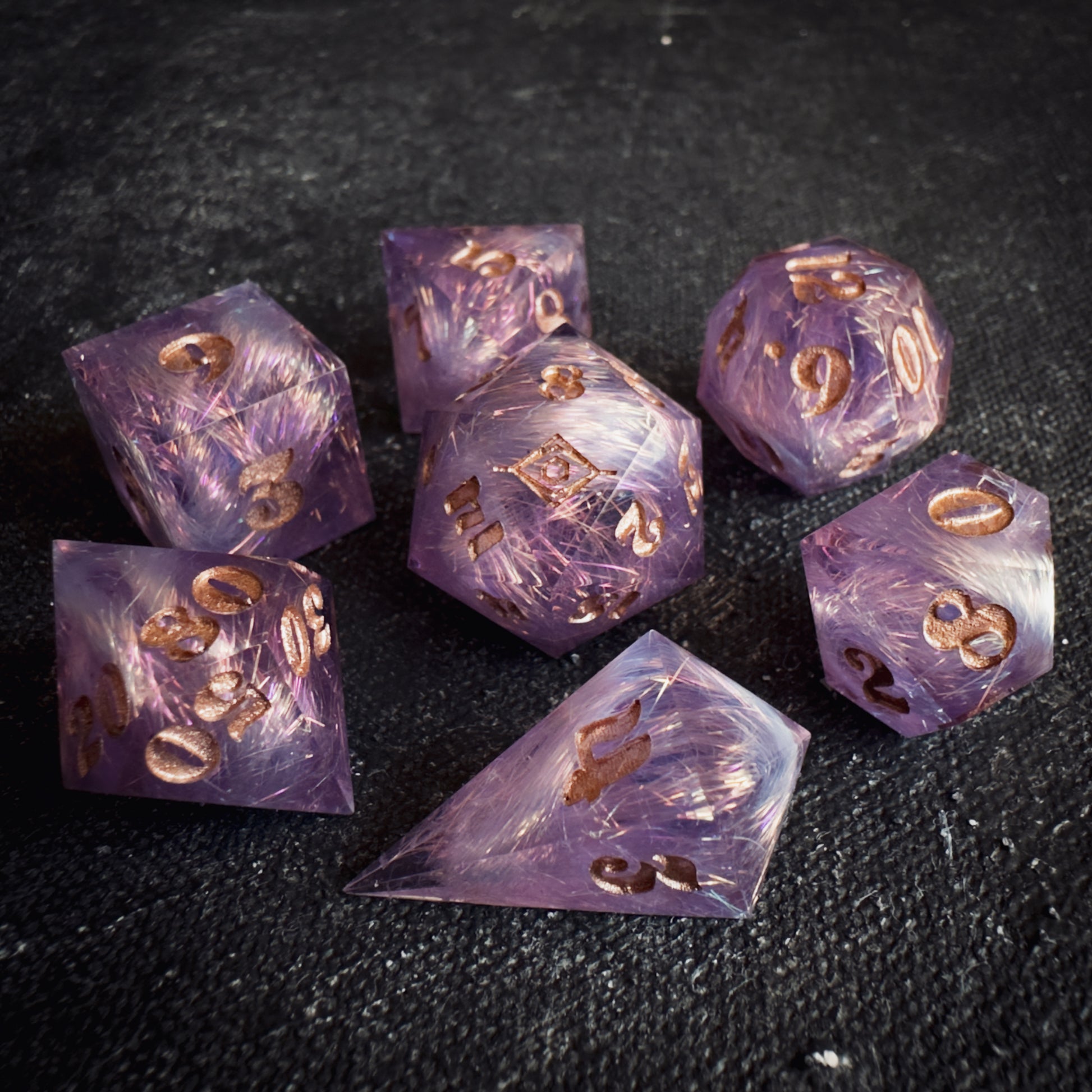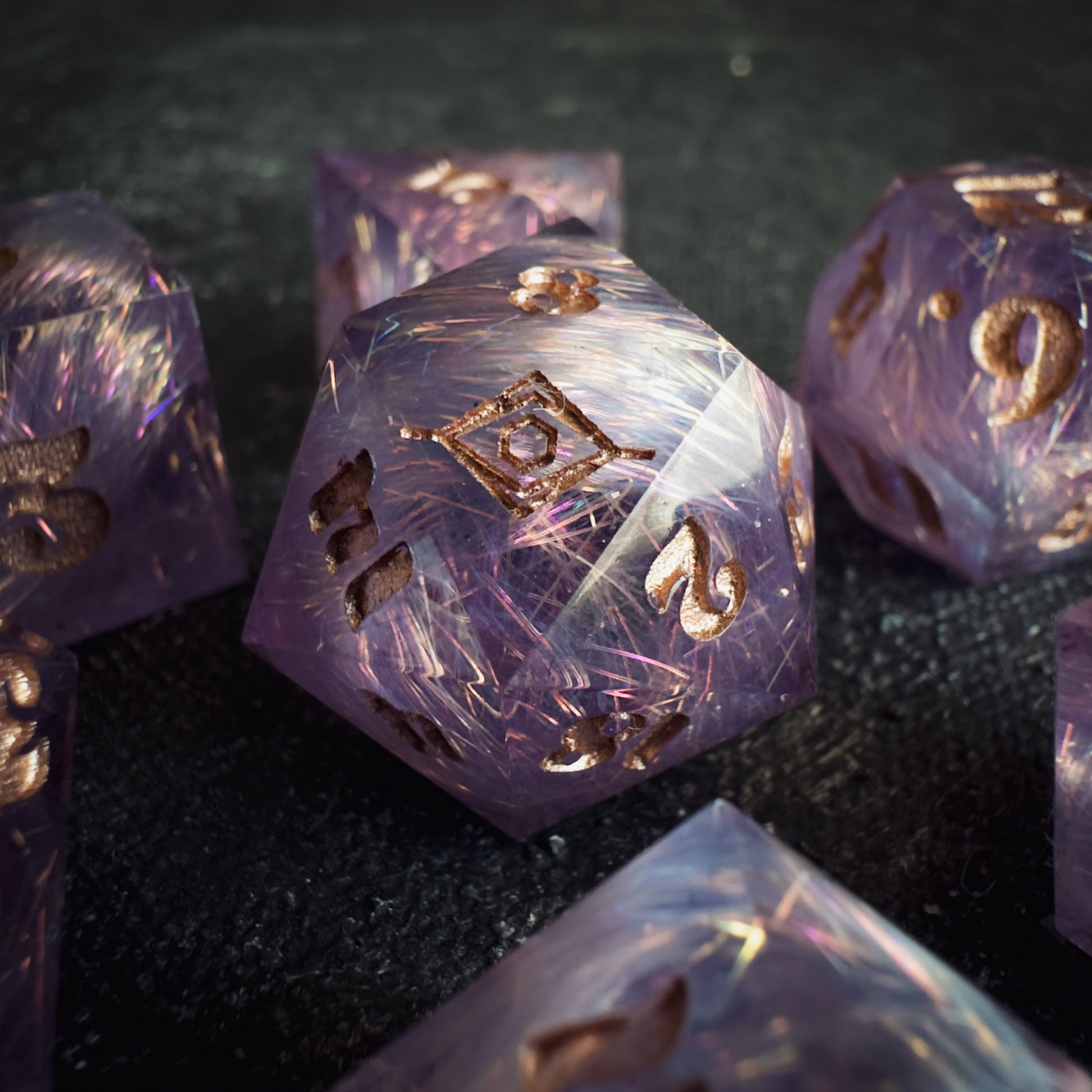 These dice are handmade, and therefore may contain some small imperfections such as microscratches, inclusions approaching the surface, or microbubbles. I do my best to minimize and note any flaws or marks, but they are entirely handmade pieces of functional art, and therefore will have small imperfections. Please bear this in mind when you purchase.
