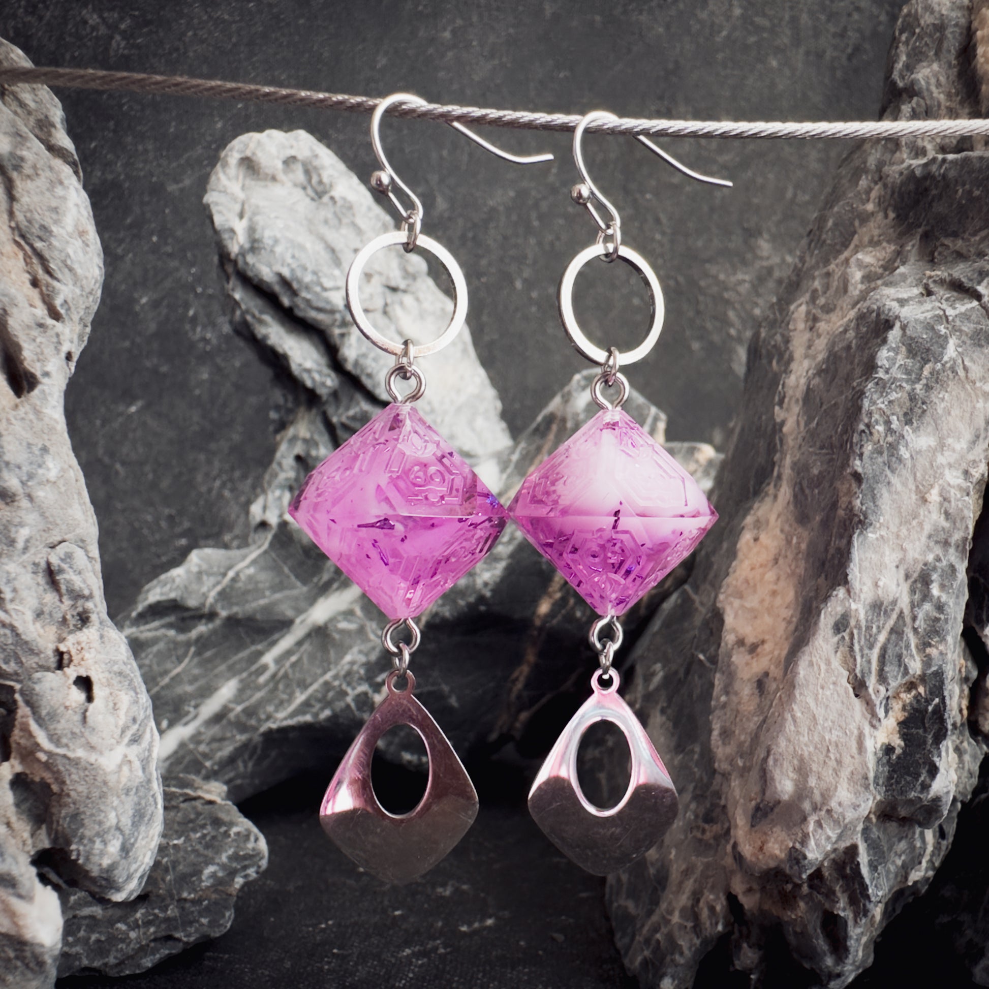 This pair of orchid D8 dice earrings is perfect for your next game night, adventure, or any time you want to bring your stories with you. Our sharp edge resin dice are poured, sanded, and painted by hand.
