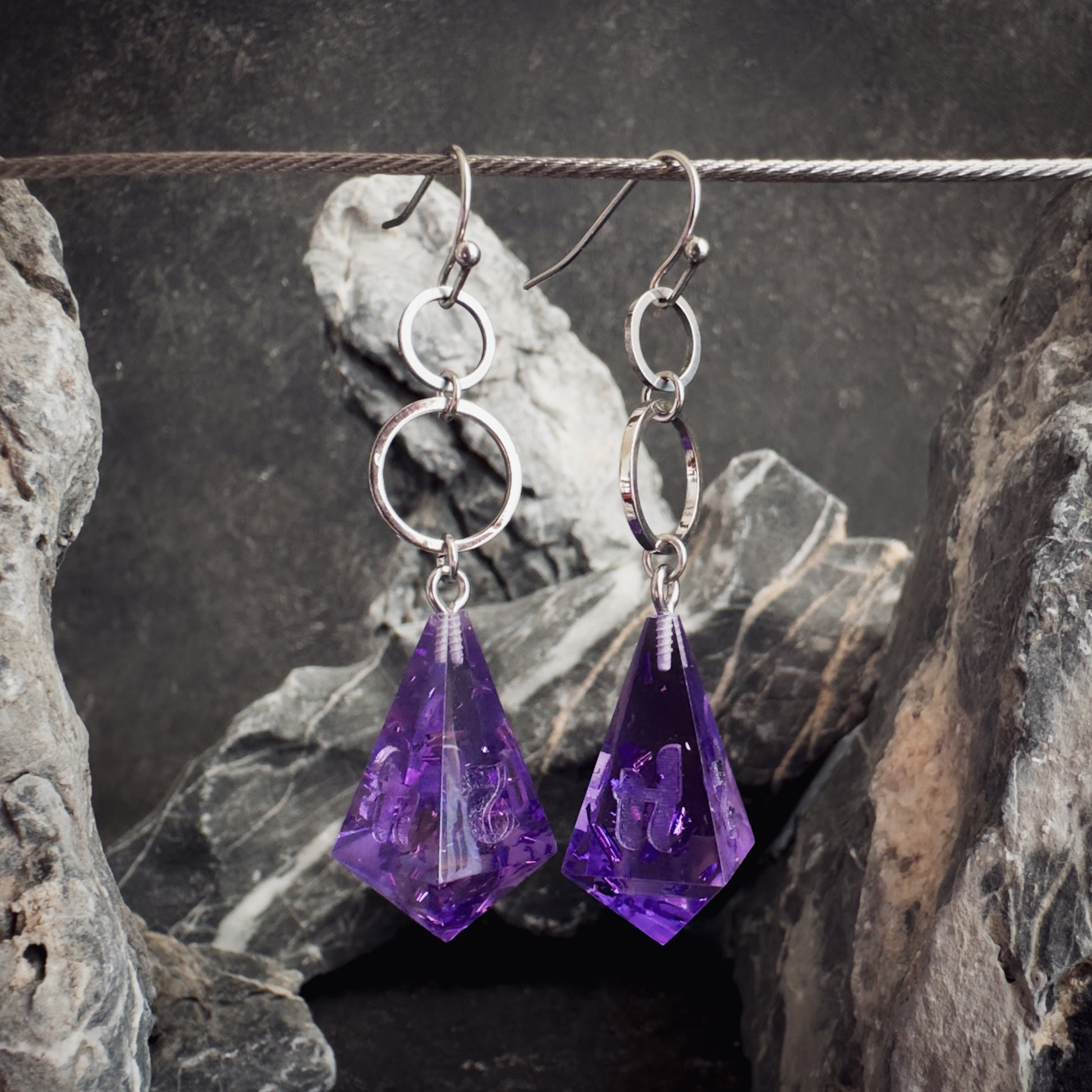 This pair of purple D4 dice earrings is perfect for your next game night, adventure, or any time you want to bring your stories with you. Our sharp edge resin dice are poured, sanded, and painted by hand.