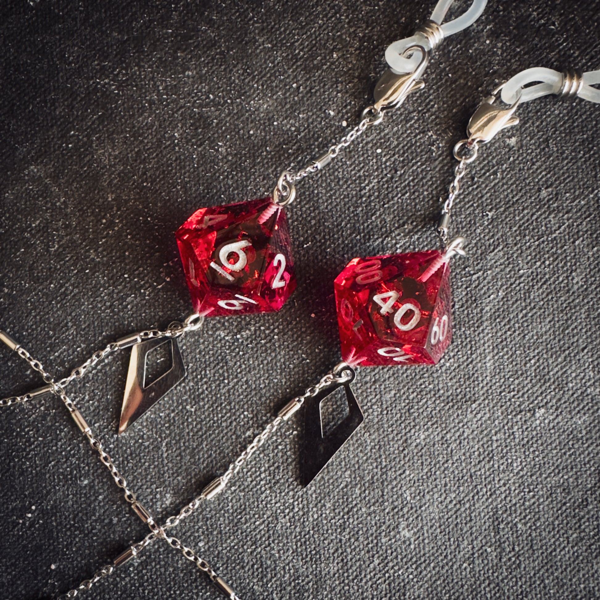 These dice glasses chains are a subtle nod to the stores you carry with you. Artisan, sharp edge resin D100 dice in red are dangling from elegant stainless steel glasses chains.